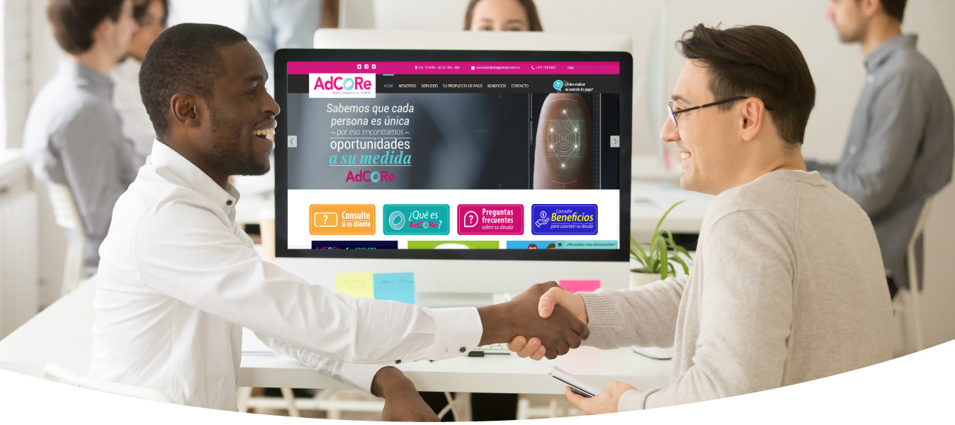 ADCORE S.A.S. es una compañía legalmente constituida, especializada en la valoración y recuperación de cartera castigada, adquirida a instituciones financieras. Nuestra actividad se desarrolla dentro del marco general de la debida diligencia y considerando los derechos de los clientes.